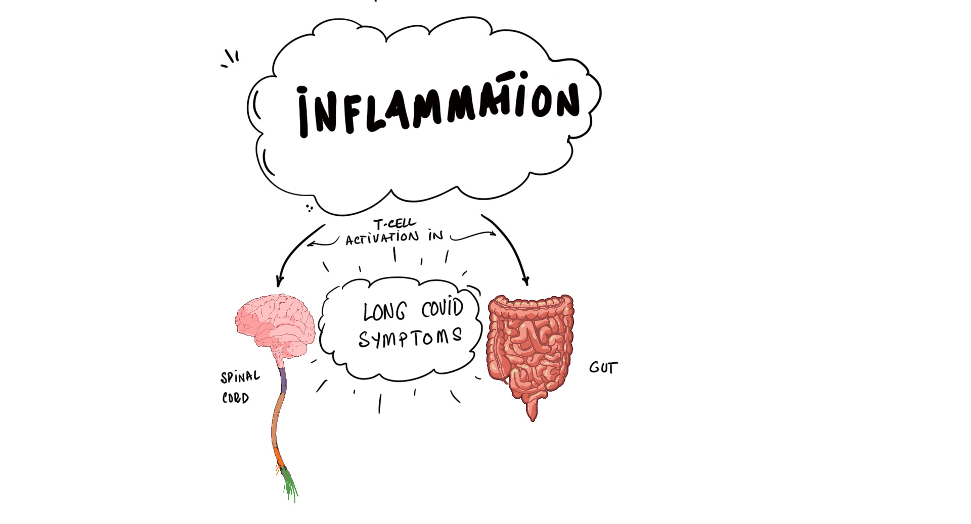 Figure 2: researchers found evidence of replicating virus and resultant immune activation leading to inflammation. Long COVID symptoms were present in individuals with immune activation in spinal cord or GIT.