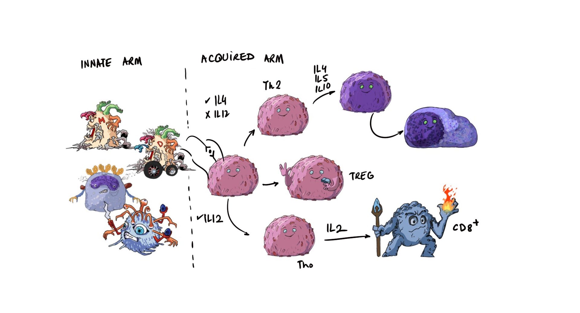 Figure 3: a virus or a virally infected cell will activate the innate arm cells (CD68+ cells found in this study), which in turn will activate the T cells on the acquired arm side. These T cells in turn can lead to activation of cytotoxic cells (CD8+) and/or B cells to make antibodies (dark purple cells on the upper right).
