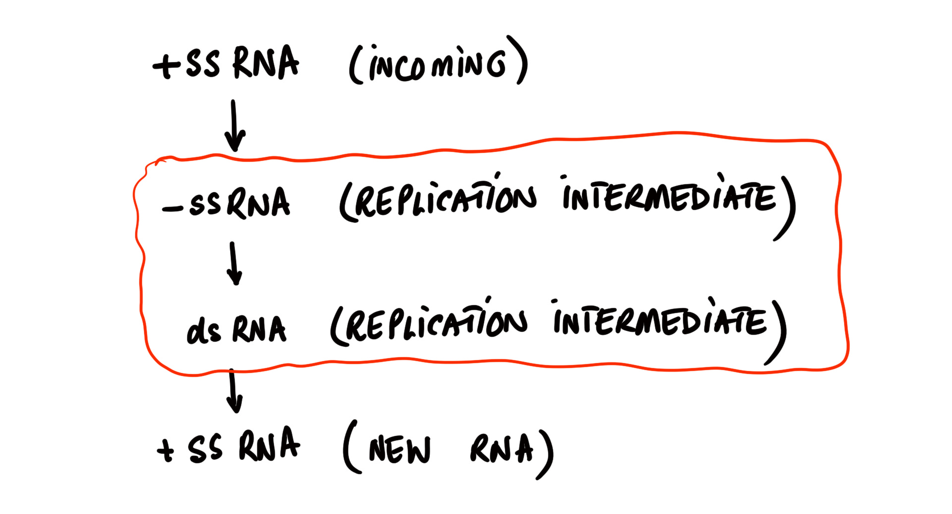 Figure 1: SARS-COV-2 enters our cells having positive sense single stranded RNA (+ssRNA). Part of the replication process is to make negative single stranded RNA (-ssRNA). Positive and negative sense RNA combine to make double stranded RNA (dsRNA). And, finally +ssRNA are made that will be contributed to the newly formed viruses.